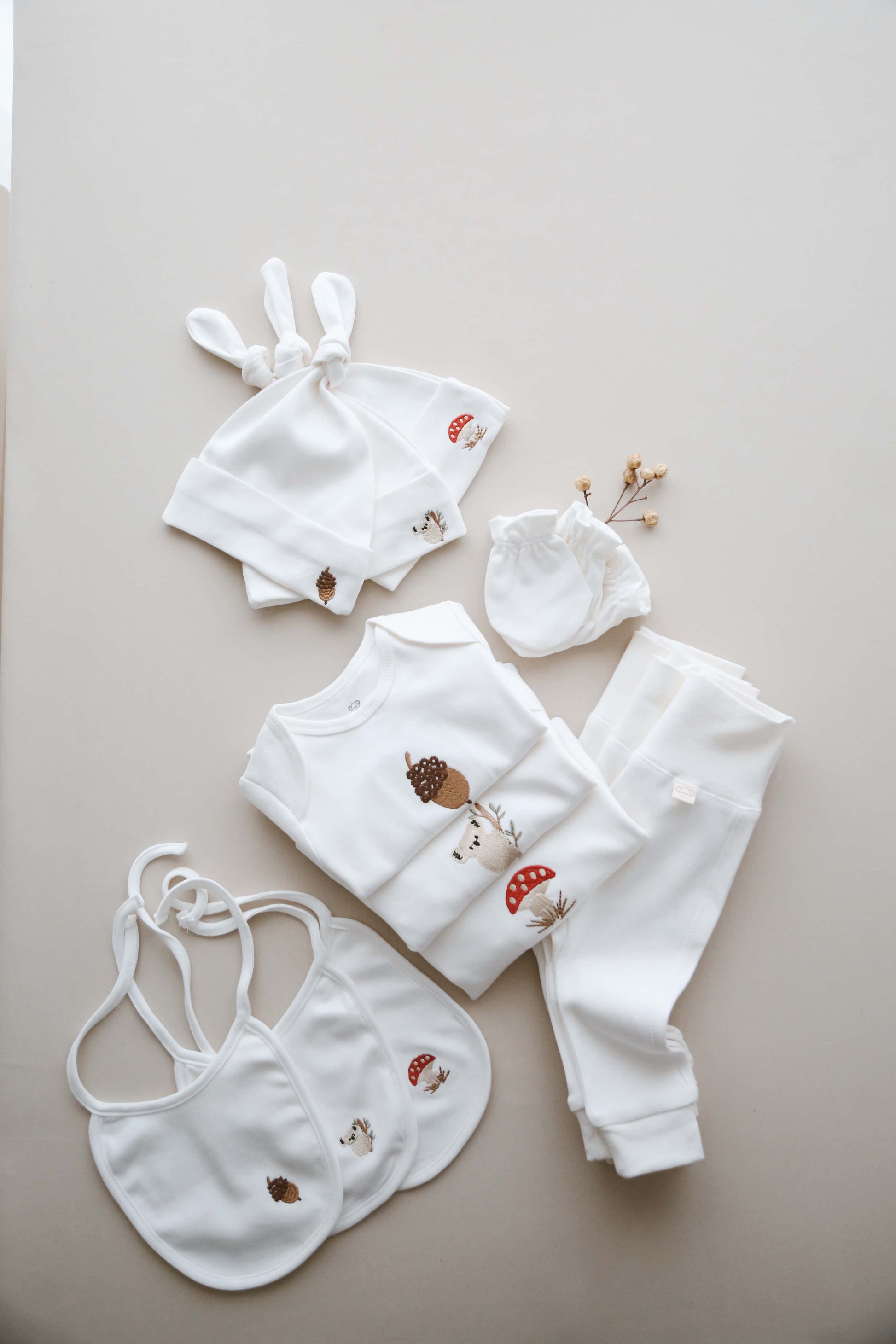 Package contents: 1 piece of embroidered snap body , 1 embroidered hat , 1 tights , 1 piece baby bib and 1 pair of gloves