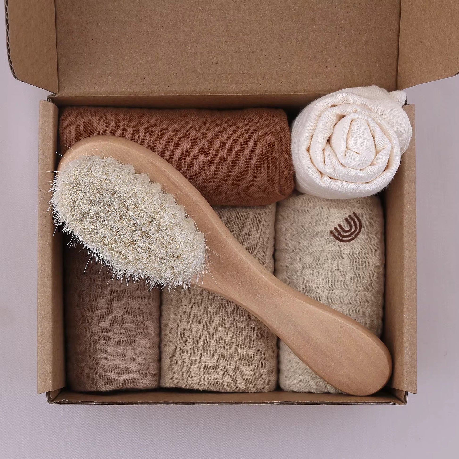 The package includes: 5 organic cotton muslin baby towels (23*23cm) and 1 hairbrush